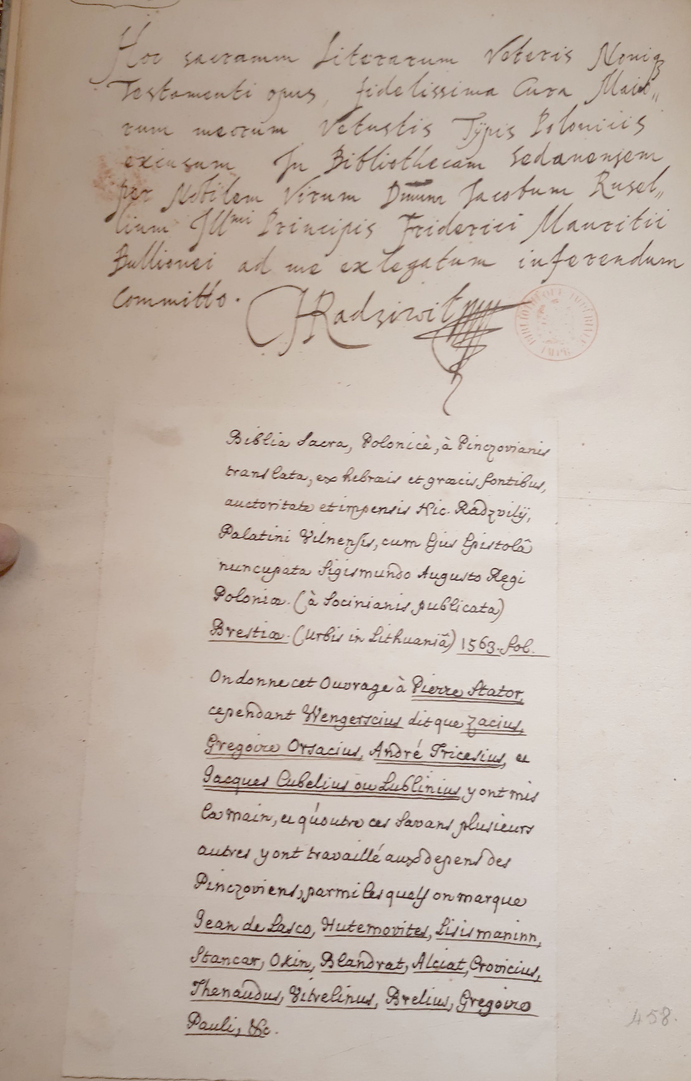 W dniach 28-30 marca 2019 roku p. Stanisław Siess-Krzyszkowski i prof. Wacław Walecki byli gośćmi Biblioteki Polskiej w Paryżu oraz Francuskiej Biblioteki Narodowej. W obu tych instytucjach nawiązano kontakty naukowe oraz zapoznano się ze zbiorami starodruków a w wypadku Biblioteki Polskiej także druków XIX wieku. Zbadano trzy egzemplarze Biblii Brzeskiej (w tym ów szczególnie cenny z dedykacją Krzysztofa Radziwiłła, syna Krzysztofa „Pioruna” – ofiarowany prawdopodobnie ok. r. 1624 z dedykacją dla księcia Fryderyka Maurycego de Boullion do Biblioteki Sedańskiej). Pamiątkowe zdjęcie na tle osiemnastowiecznych globusów (tu po raz pierwszy zaznaczona świeżo odkryta Australia jako Nowa Holandia) pokazuje rozmach, z jakim zbudowano FBN/BNF.