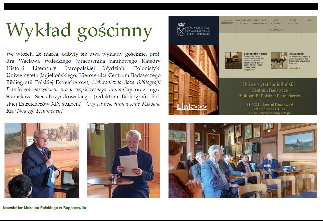 W dniach 24-27 marca prof. Wacław Walecki i p. Stanisław Siess-Krzyszkowski byli gośćmi Muzeum Polskiego w Zamku w szwajcarskim Rapperswil. Zapoznali się z zasobem cennych dla naszych badań starodruków i publikacji dziewiętnastowiecznych zgromadzonych w tej istniejącej od prawie 150 lat placówce. Do faktu tego nawiązał w swoim referacie prof. Walecki, nazywając Bibliografię Polską Estreicherów siostrzaną bliźniaczką Muzeum (oba przedsięwzięcia powołano do życia w 1870 roku), a p. Krzyszkowski mówił o charakterystycznych cechach pracy Mikołaja Reja nad przekładem Nowego Testamentu (notka w Newsletter) . Zadzierzgnięta współpraca zaowocuje niebawem przy kolejnej Stałej Konferencji Muzeów, Bibliotek i Archiwów na Zachodzie.